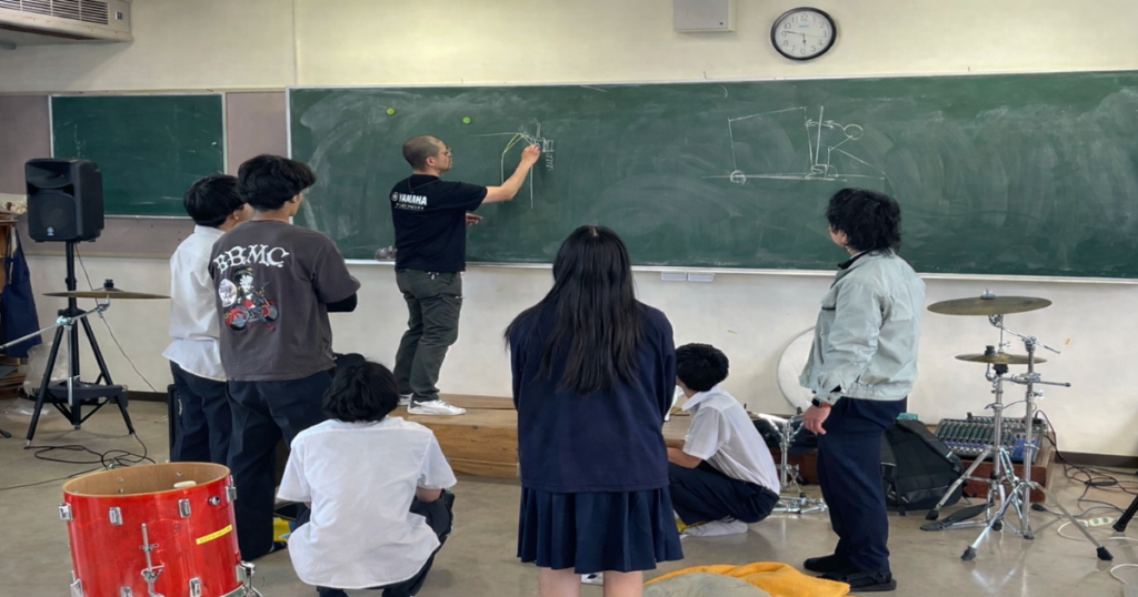 自身も高校1年生の時にドラムを始めたことから、ドラムの手入れについては特に熱を入れて説明しているといいます。「どこの学校にいっても、まずはドラムセットの状態をチェックします。ドラムセットに関して『だれもわからない』ということが多く、埃だらけだったり、セッティングがガタガタのままのことがとても多いです。そのため、ドラムセットの状態を改善することはもちろん、部室や他の楽器を掃除することから始める場合が多いです」。その後、部員と一緒に、チューニングやセッティングの見直しも施したうえでドラムの音を出すと、楽器から出てくる音の違いに顧問も部員もワッと驚くとのこと。「部員の皆さんが『わー!音が違う!』『部室のセットじゃないみたい!』『ライブハウスの音がする!』と喜んでくれる瞬間は、とても嬉しいです。そのほかにも、たとえばドラムを叩く時のフォームを少しアドバイスするだけで、『変わった!』と感動してくれます。その瞬間を、部員の皆さんと共有できることにやりがいを感じます」