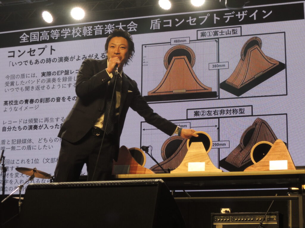 この盾は、楽器のボディーに使われている素材で作られており、盾の頂点には、本大会のライブ音源が収録されたEP盤が配置されています。「きょうここで生み出された瞬間、永遠の命を持つ音源」が盾としてずっと保存されることになります。