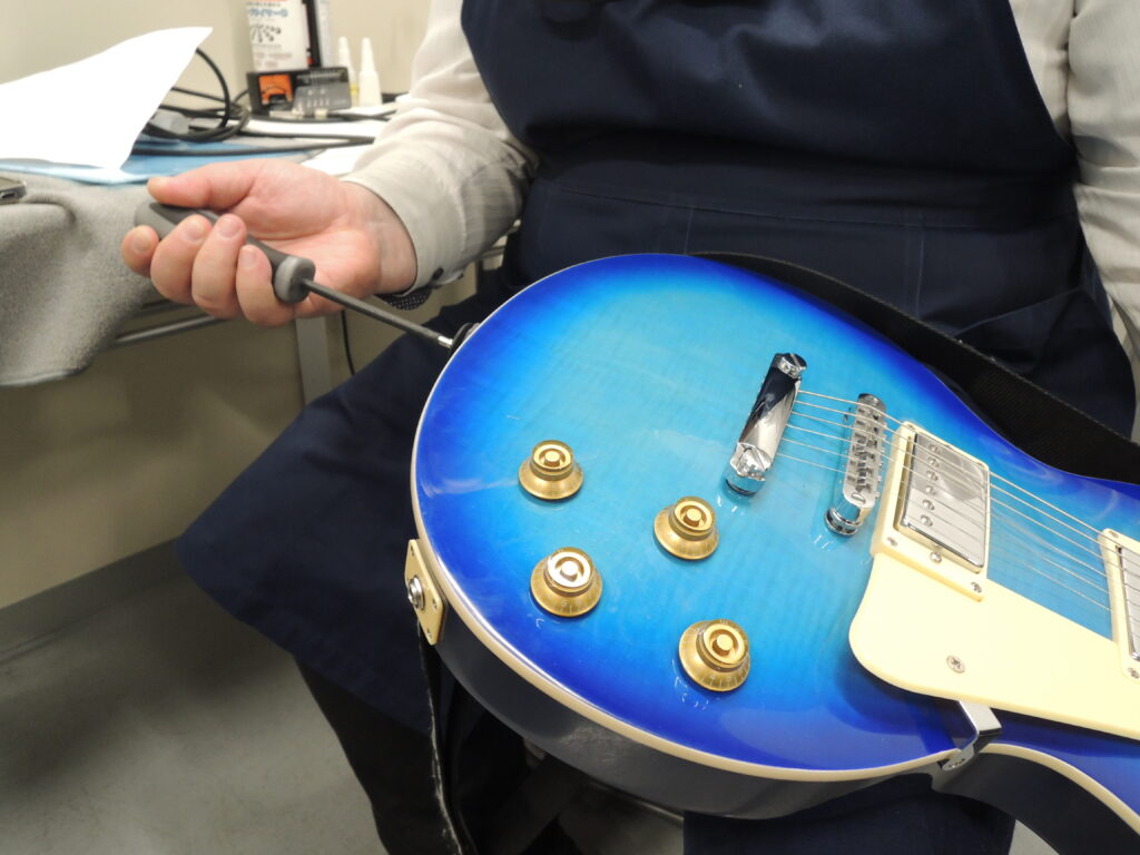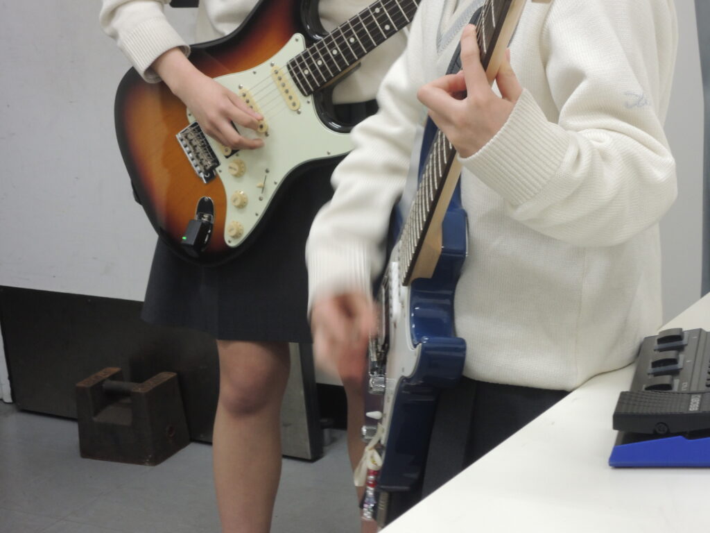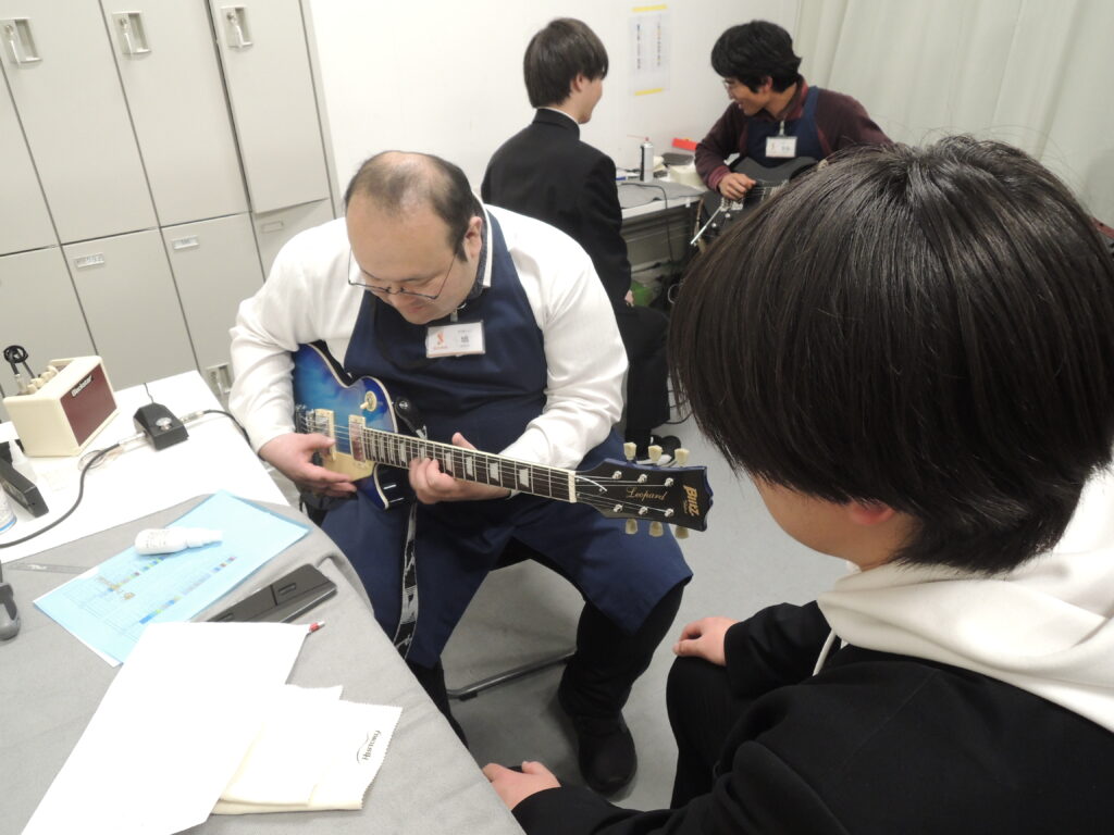 ステージ裏の楽器調整部屋には、島村楽器のスタッフたちが勢ぞろい。エレキギターのチューニングやエフェクターの調整、ストラップピンの調整など、本番を直前に控えた軽音楽部員たちを陰で支えてくれました。演奏途中に弦が切れたバンドのメンバーが慌てて調整部屋に駆け込み、弦を張り替えてもらって再びステージに上がっていく姿も見られました。