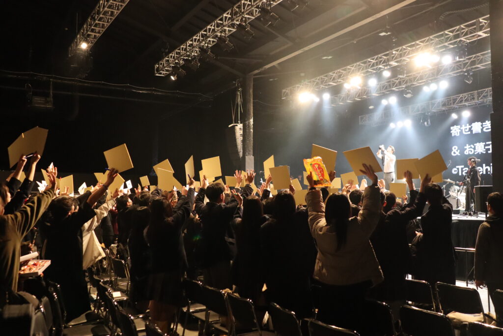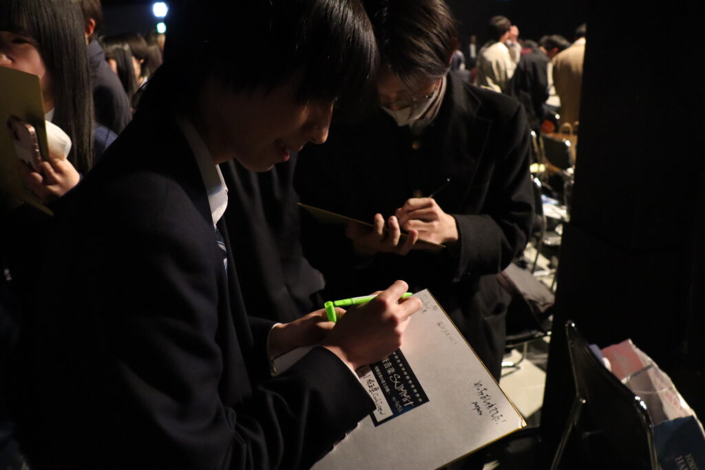 ライブ終了後は、軽音楽部員たちが地元から持ち寄ったお菓子を他校のバンドメンバーたちと交換し、お互いを応援するメッセージを色紙に書き合います。超絶技巧で会場を沸かせたギタリストの前に、何人もの女子生徒が並ぶような場面も見られました。集められた寄せ書きとともに参加者全員で記念写真を撮影し、大会は大盛況のまま終幕しました。